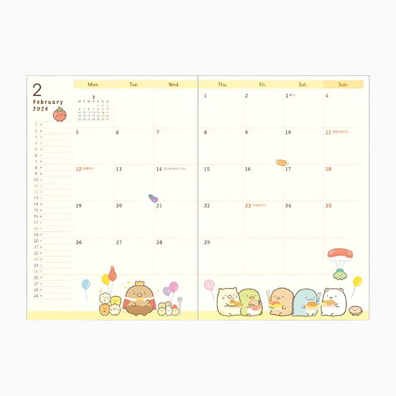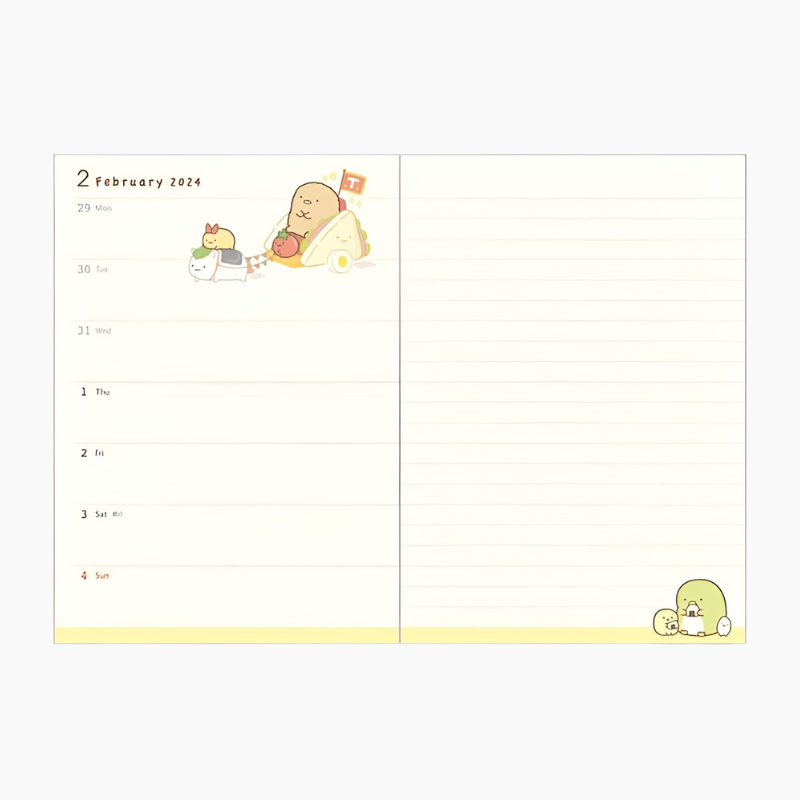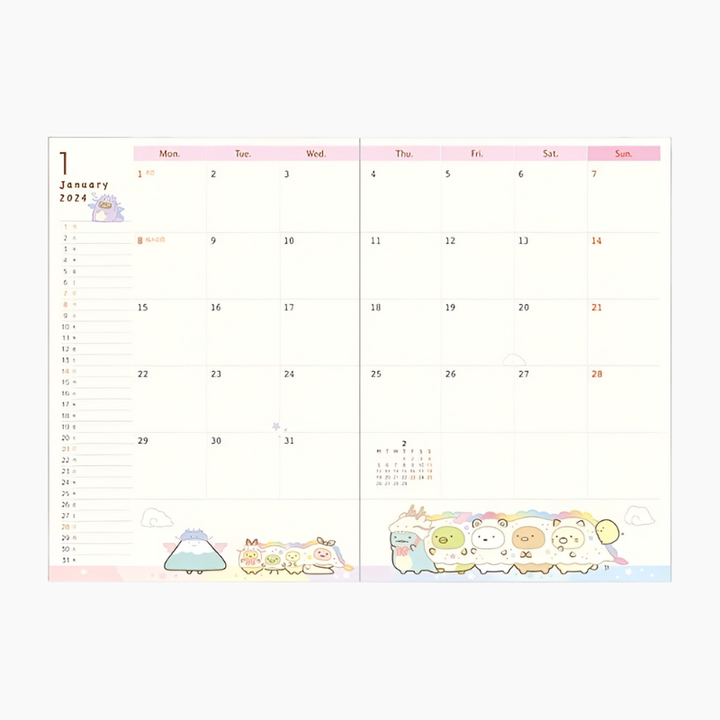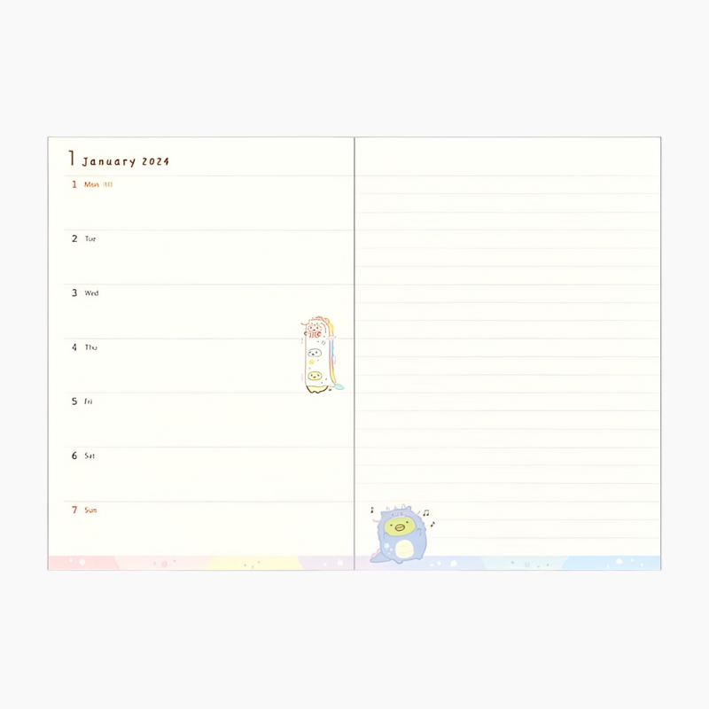 Get ready to make 2024 a year filled with cuteness and organization with our 2024 Sumikko Gurashi B6 Schedule Book! Adorned with adorable Sumikko Gurashi illustrations, makes planning your year, months, and weeks a whole lot more delightful. Inside, you'll discover a carefully designed layout that includes a two-page weekly spread, giving you plenty of space to jot down your weekly plans and thoughts. Plus, with its sturdy plastic cover, you can carry this planner with you to work or school without worry.